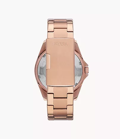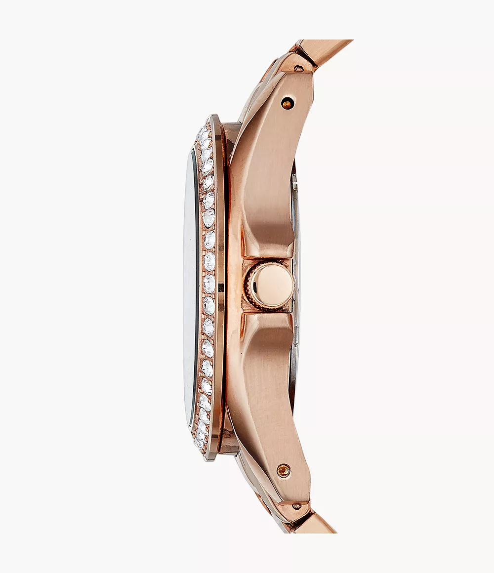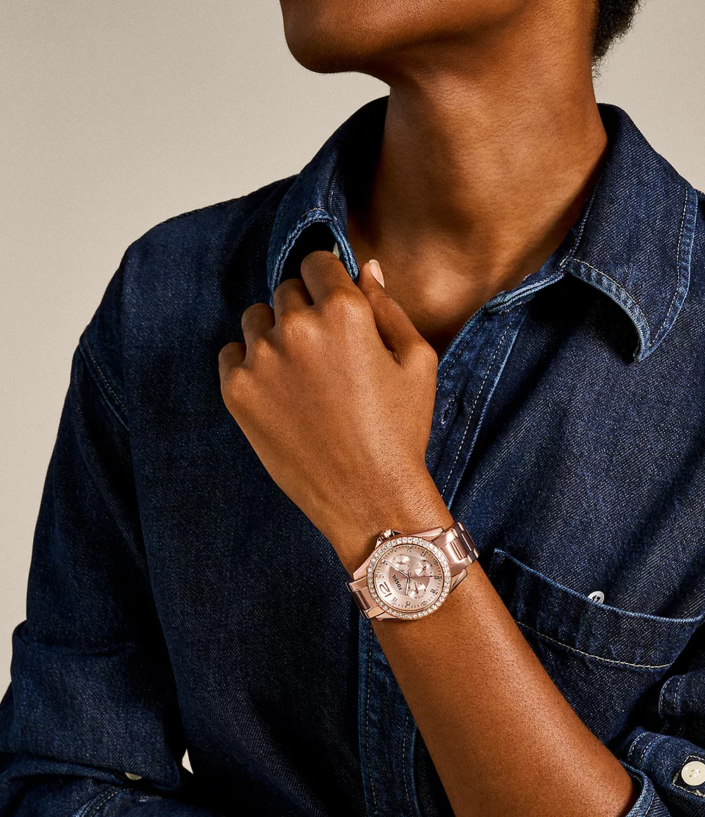 Our signature Riley style with a 45-stone topring, features a rose gold-tone finish and a textured rose dial. This Riley watch also features a multifunction movement.