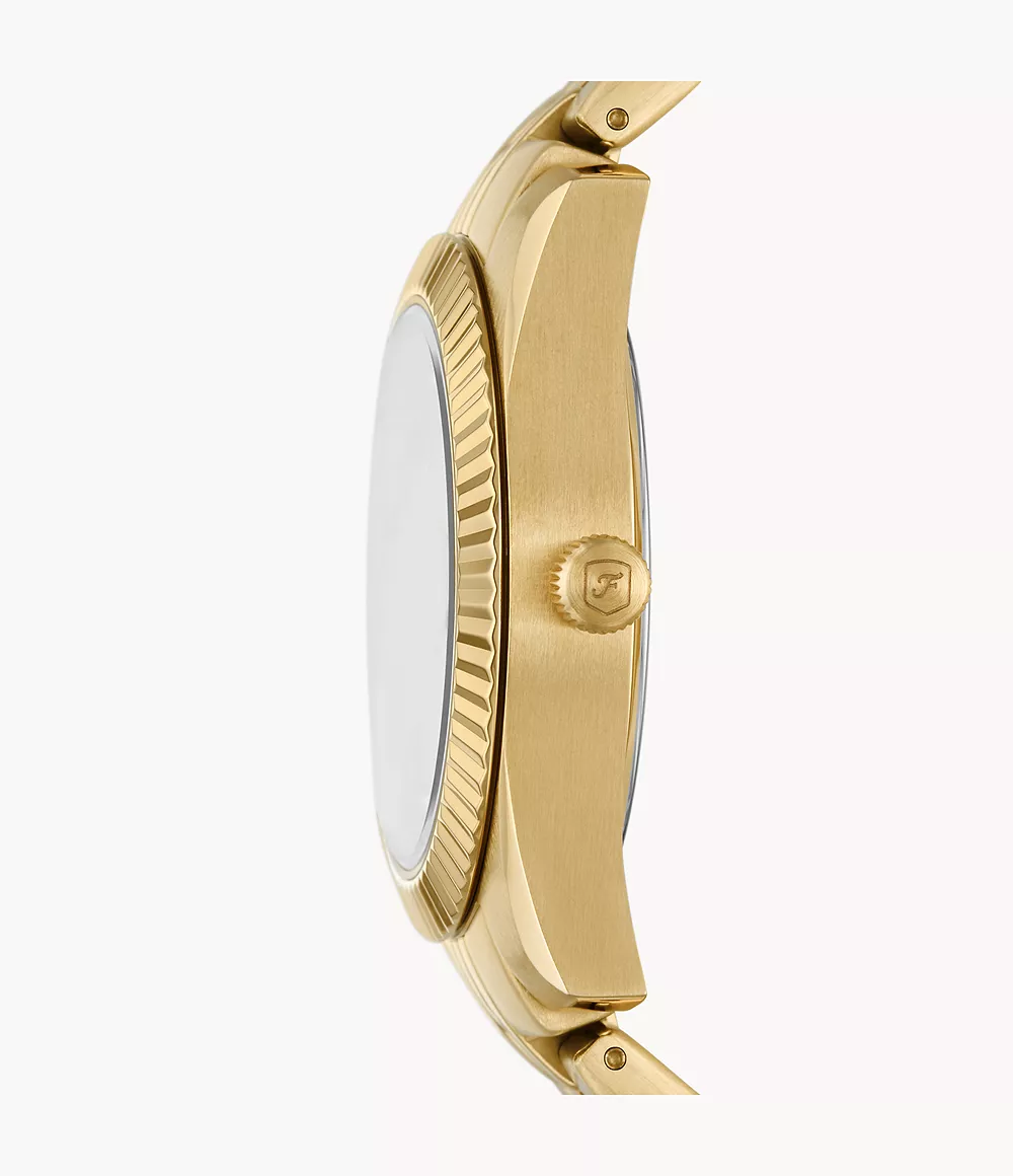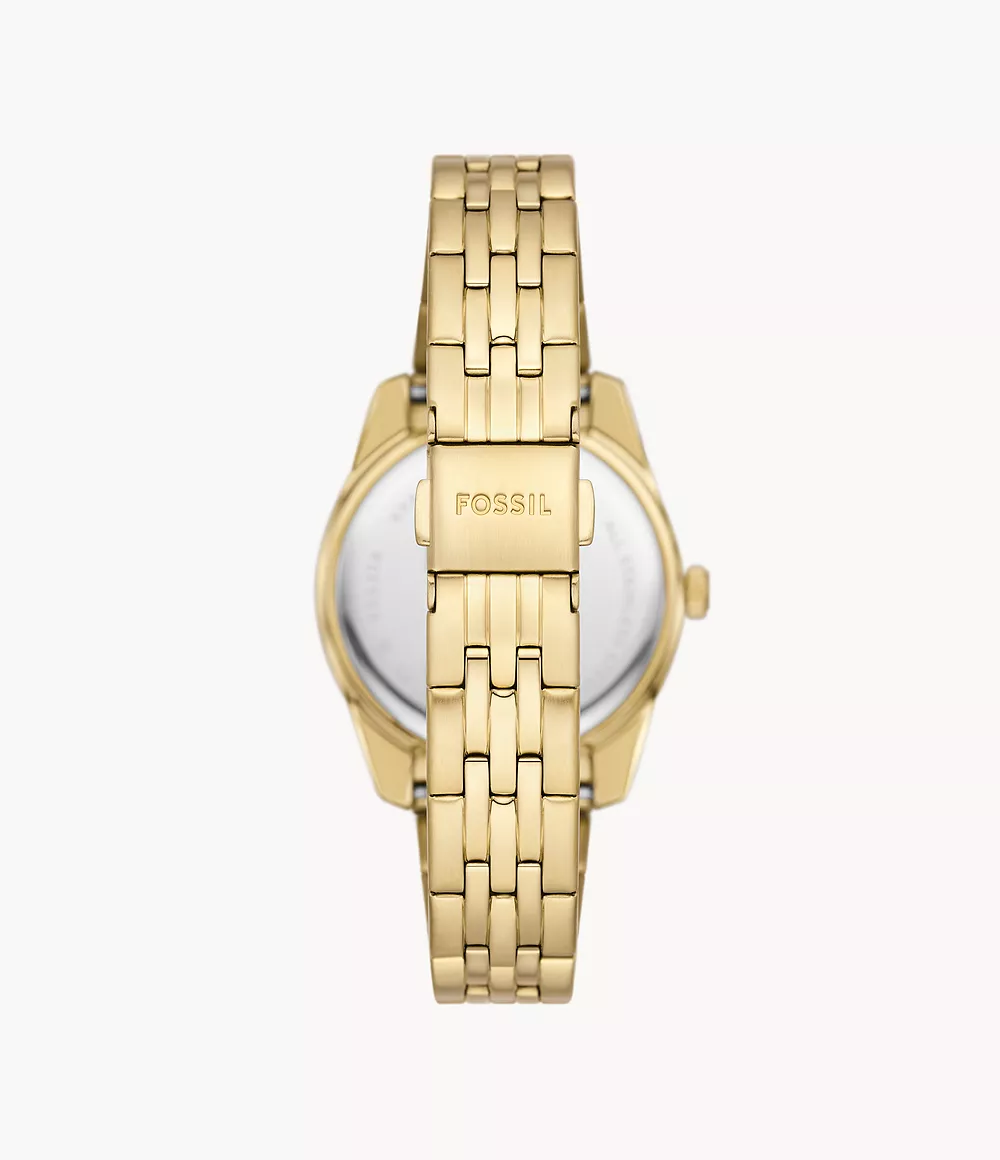 This 32mm Scarlette features a gold sunray dial, three-hand date movement and gold-tone stainless steel bracelet.