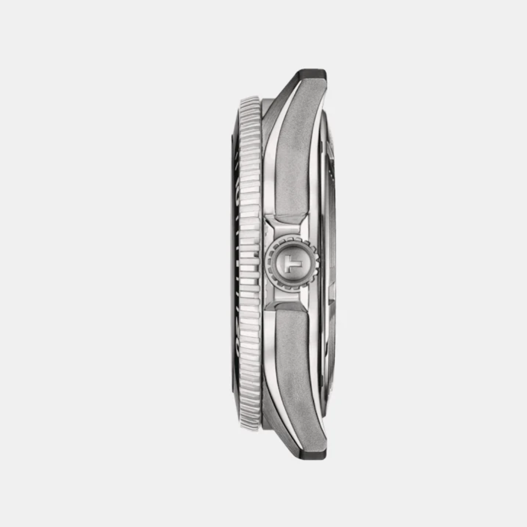 TISSOT. The black round dial is protected by a sapphire glass. It