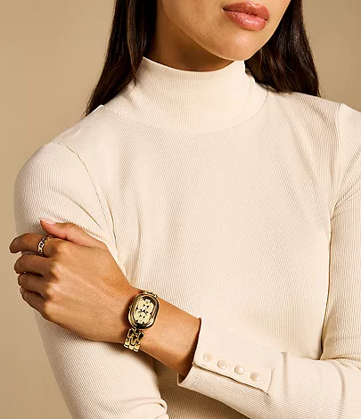 Our newest platform is a striking marriage of jewellery and watch functionality. Each piece of the skeletonized dial is hand-applied by our watch artisans—an impressive feat of craftsmanship that creates an illusion of links extending through the oval-shaped case. A crystal at the 12-hour marker is the finishing touch.