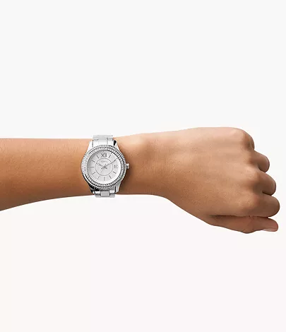 This 37mm Stella features a white mother-of-pearl semi-gloss dial, three-hand date movement and stainless steel bracelet.