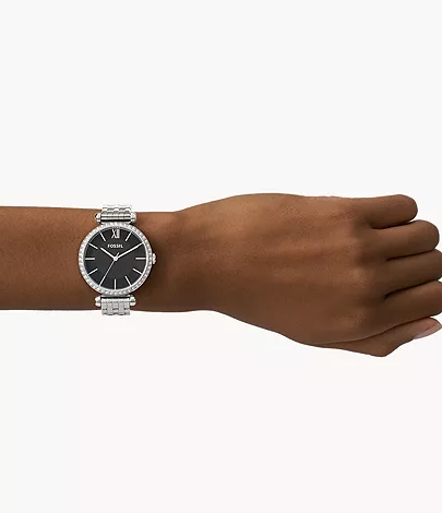 This 36mm Tillie features a black CD finish dial with a glitz bezel, three-hand movement and a stainless steel bracelet.