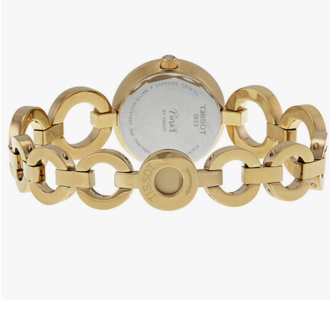 gold PVD bezel. Mother of pearl dial with gold-tone hands. An Arabic