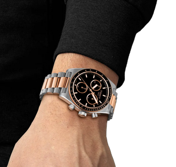 bold black dial and striking PVD rose gold accents. With its bi-colour