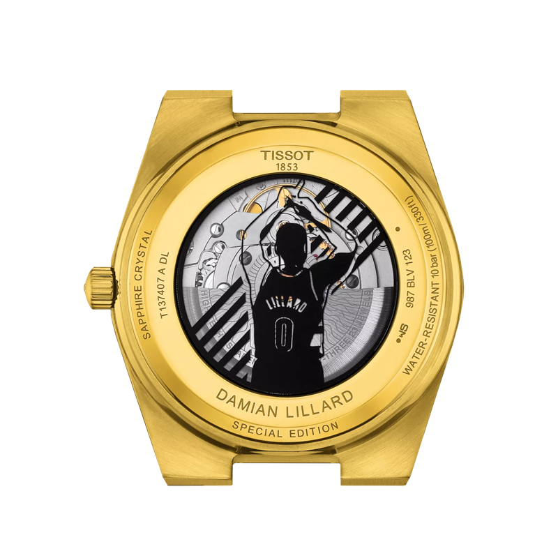 This special edition watch blends the well-known features of the PRX Powermatic 80 with unique elements that reflect Lillard's personality and career. Based on the gold PVD model variant, this timepiece boasts a distinct black dial embossed with the number '0', a nod to Lillard's jersey number. The second hand features Damian’s monogram, a subtle yet meaningful change. On the other side of the watch, the transparent case back offers a unique visual: the famous 'Dame Time' celebration. This element adds a layer of depth and narrative to the watch. The flange of the watch reveals more personal details, with each quadrant telling a part of Lillard's story. 'DAME' and 'TIME' adorn the top left and right corners respectively, synonymous with Lillard's on-court moniker and clutch performances. The bottom right corner, marked 'DDKK', is a heartfelt homage to his family: Damian, Damian Lamonte Ollie, Kali Emma Lee, and Kalii Laheem. The bottom left corner boldly states 'YKWTII', an acronym for 'You Know What Time It Is', setting the stage for those iconic 'Dame Time' moments.