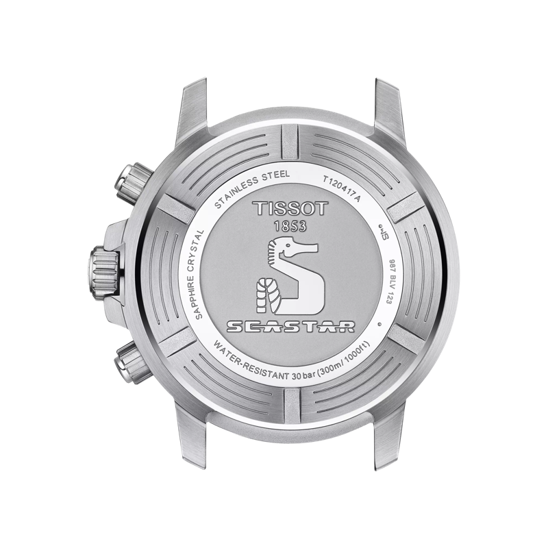 The Tissot Seastar 1000 Chronograph is the instinctive choice for water sports lovers. Its impressive water-resistance up to a pressure of 30 bar (300 m/1000 ft) is combined with the energy of a Swiss-made quartz movement. And features all the element required in a useful instrument: screw-down crown and case back, unidirectional steel bezel with aluminium ring and highly luminescent material for excellent readability in the dark.