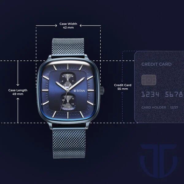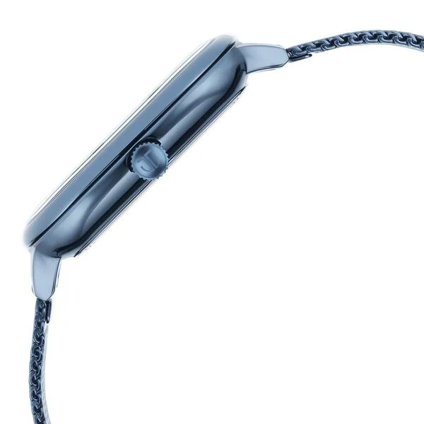 Elevate your style with this striking monochrome blue watch. The sharp rectangle dial, finished in deep blue with textured detailing, is paired with silver indices and hands. Two sub-dials add multifunctionality, perfect for day and date tracking. The blue steel strap enhances the smart casual look, making it an excellent choice for both workwear and casual outfits.