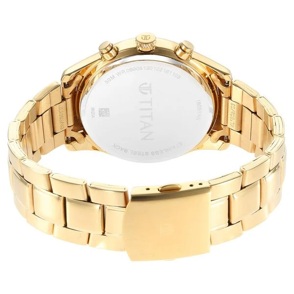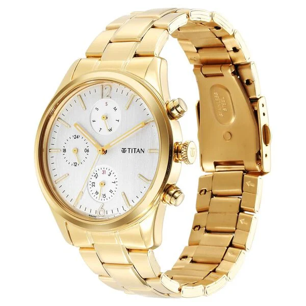 Display Brand Titan Name Titan Black and Gold Silver Dial Analog with Day and Date Stainless Steel Strap Watch for Men