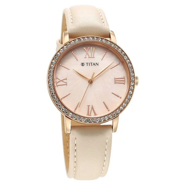 Display Brand Titan Name Titan Purple Style Up Quartz Analog Pink Dial Leather Strap Watch for Women