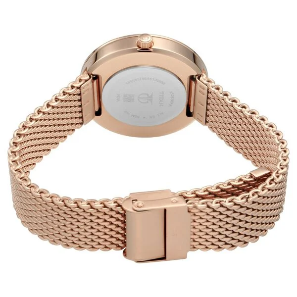 Immerse yourself in the celestial theme with this impeccable analog women's watch from Titan's Stellar collection. The mint-hued dial, crystal-embellished bezel, and Milanese rose gold-toned mesh strap create a captivating look. With crystals and glitter, it deserves a special space in your collection.
