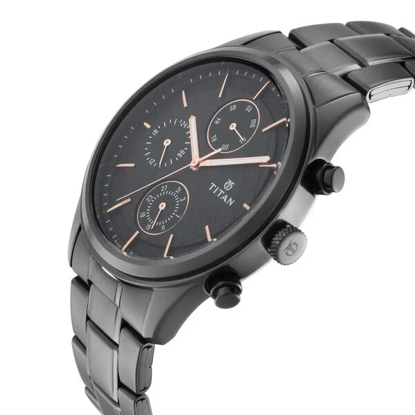 Display Brand Titan Name Titan Workwear Multifunction Black Round Dial Black Metal Strap Watch For Men