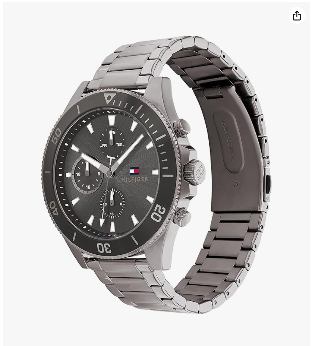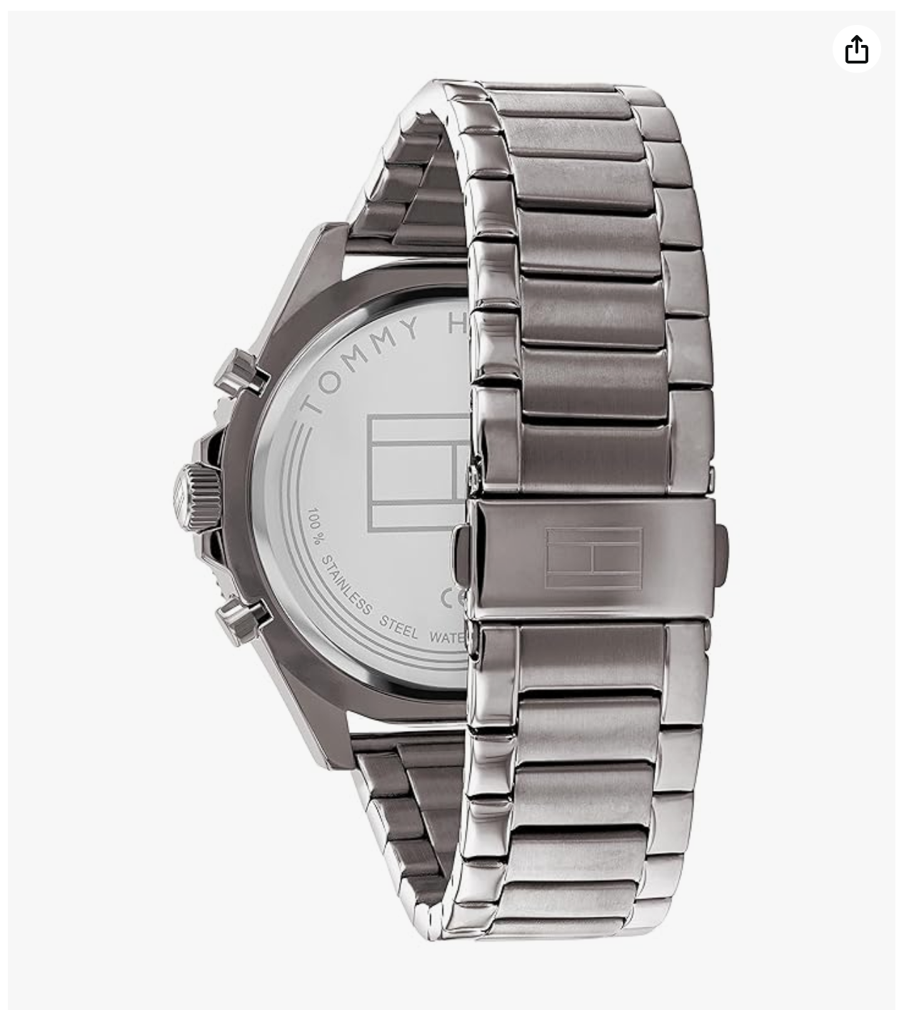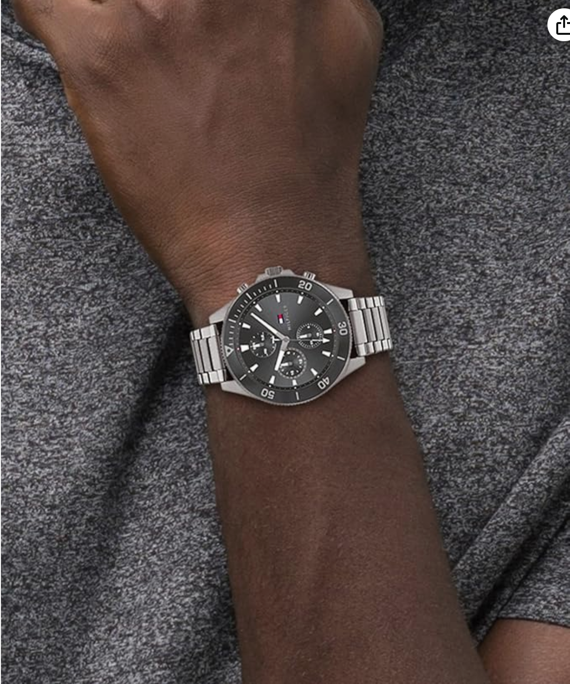 from Tommy Hilfiger. Its stainless steel strap vaunts a silver hue that