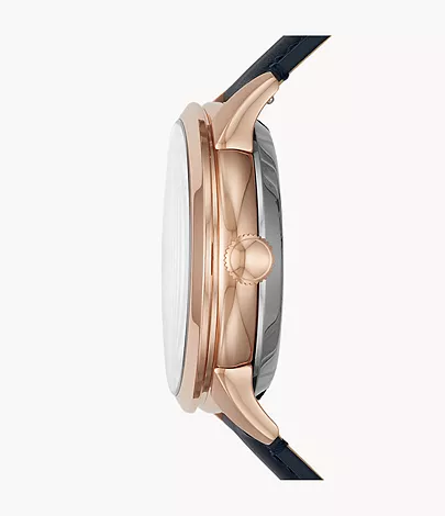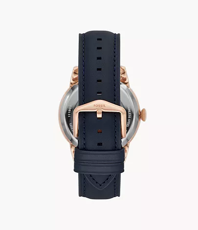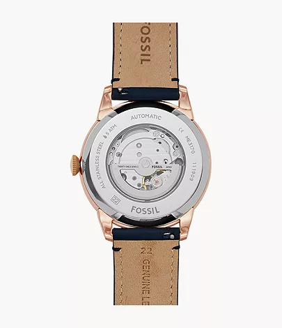 This 44-mm Townsman features a white satin dial with a see-through skeleton sub-eye, automatic movement and a navy leather strap.
