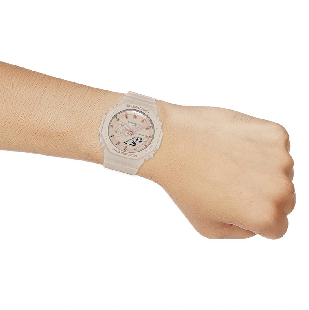 crown for time adjustment. The resin strap comes in a nude hue that