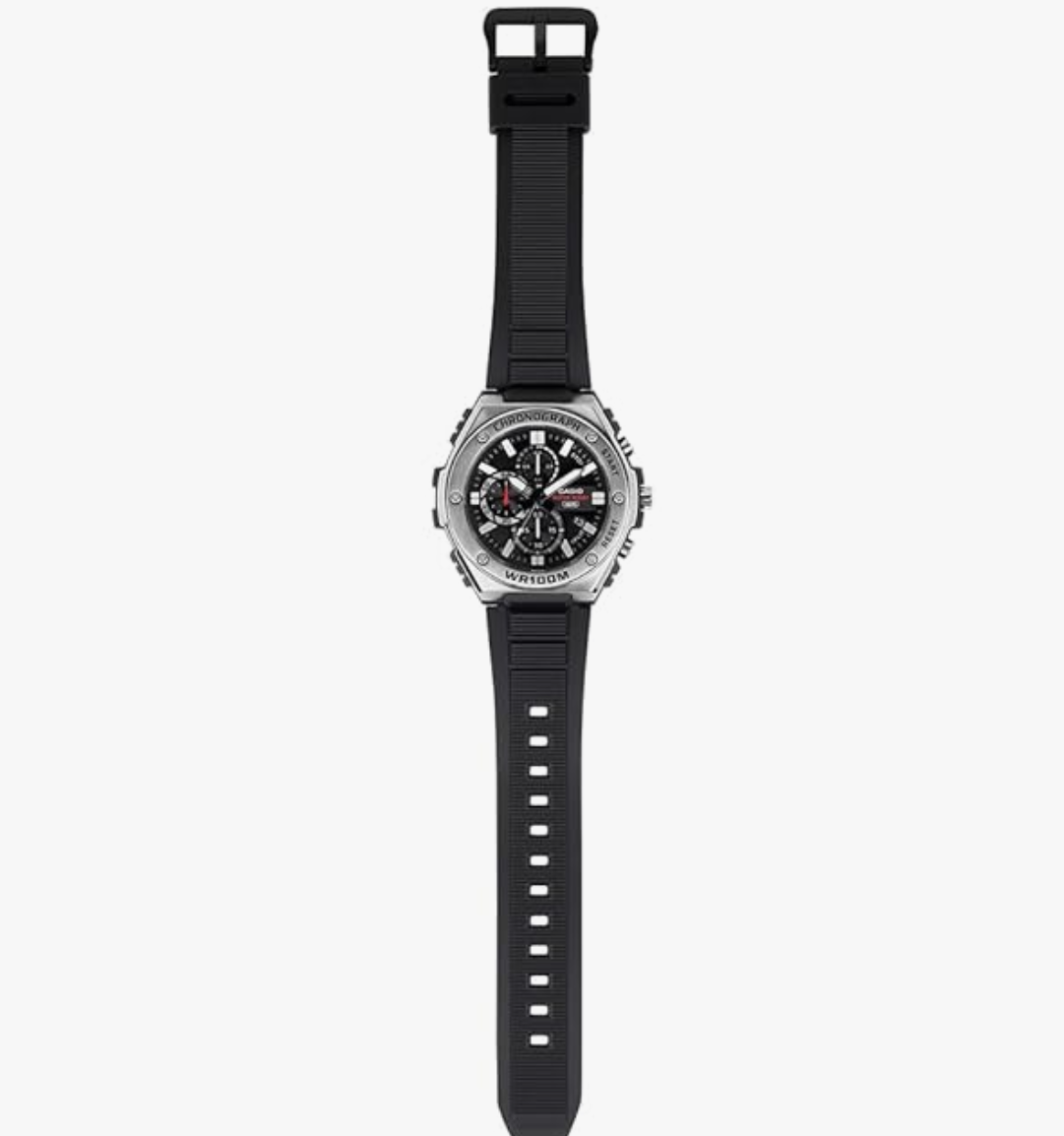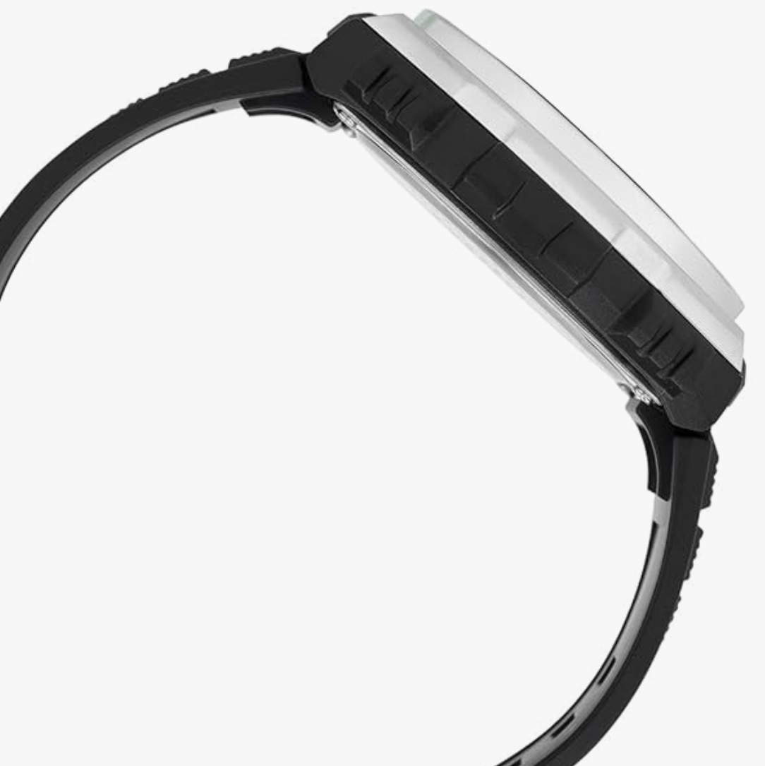 collection by Casio. The black round dial is protected by a resin glass.