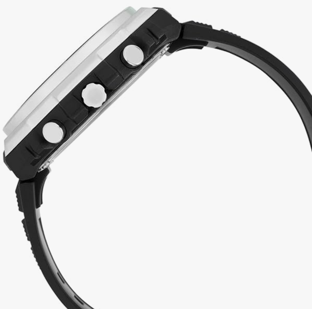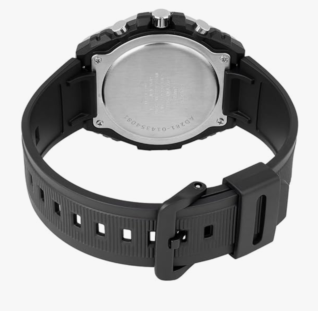 It features crown for time adjustment. The resin strap comes in a black