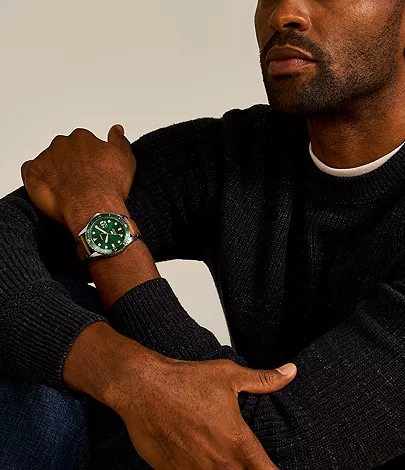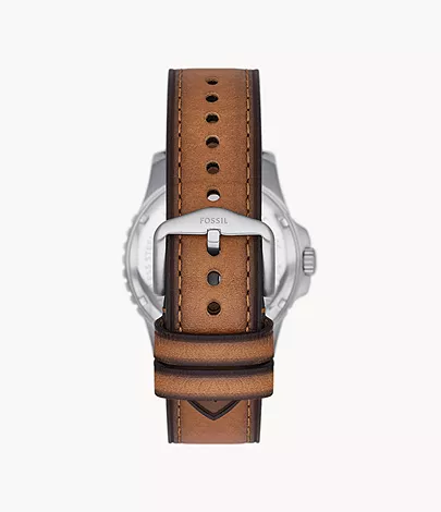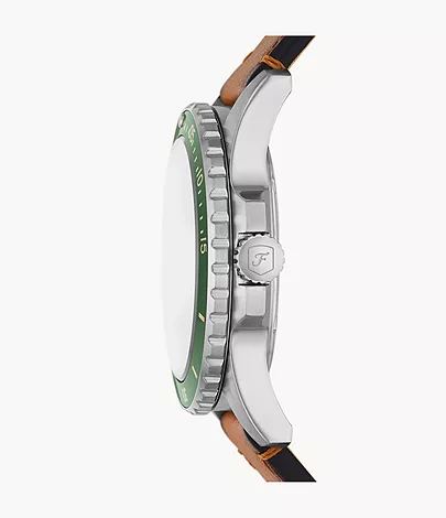 Purposeful design details define our time-honoured watch collection, Fossil Blue Dive. This dive-style timepiece is expertly crafted with a tan LiteHide™ leather strap, geometric indices and a unidirectional rotating topring. Tested to 100 meters of water resistance. *Not ISO certified.
