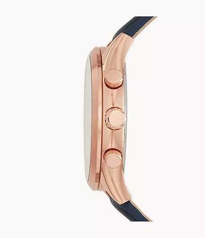 This 44 mm Fenmore features a blue satin dial with Roman numerals at the 6- and 12-hour markers, multifunction movement and a navy leather strap.