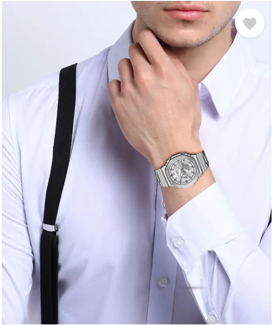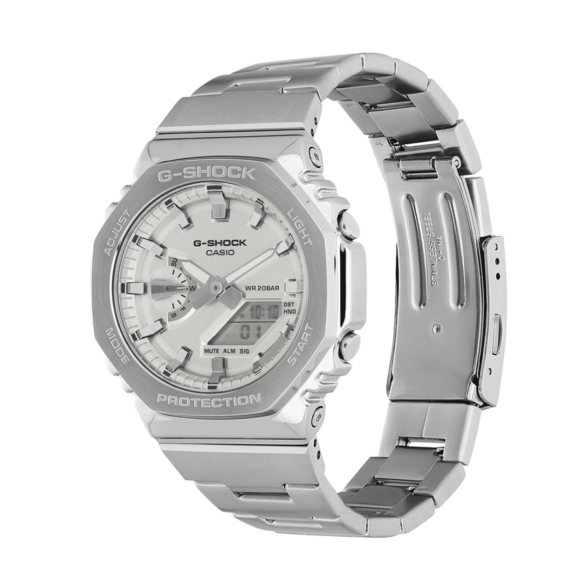 The stainless steel strap vaunts a silver hue that enhances the look of