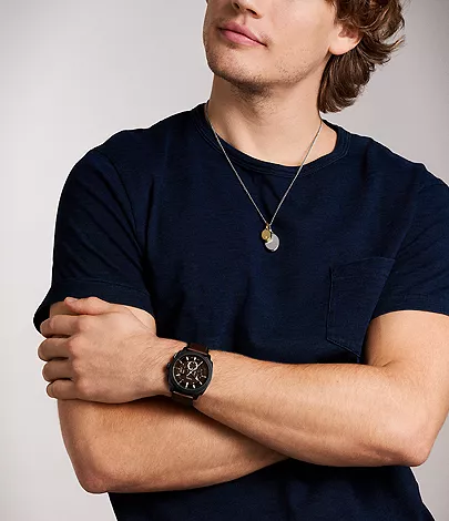 Inspired by classic American machinery, the Machine Chronograph commands attention with its bold knurled topring. Unmistakably masculine with a bold 44 mm case housing a brushed black dial with textured details, all protected by an amber-tinted mineral crystal face. Powered by a precision quartz chronograph movement, this rugged timepiece is built to last with a rich brown leather strap. A true statement in industrial-inspired design.
