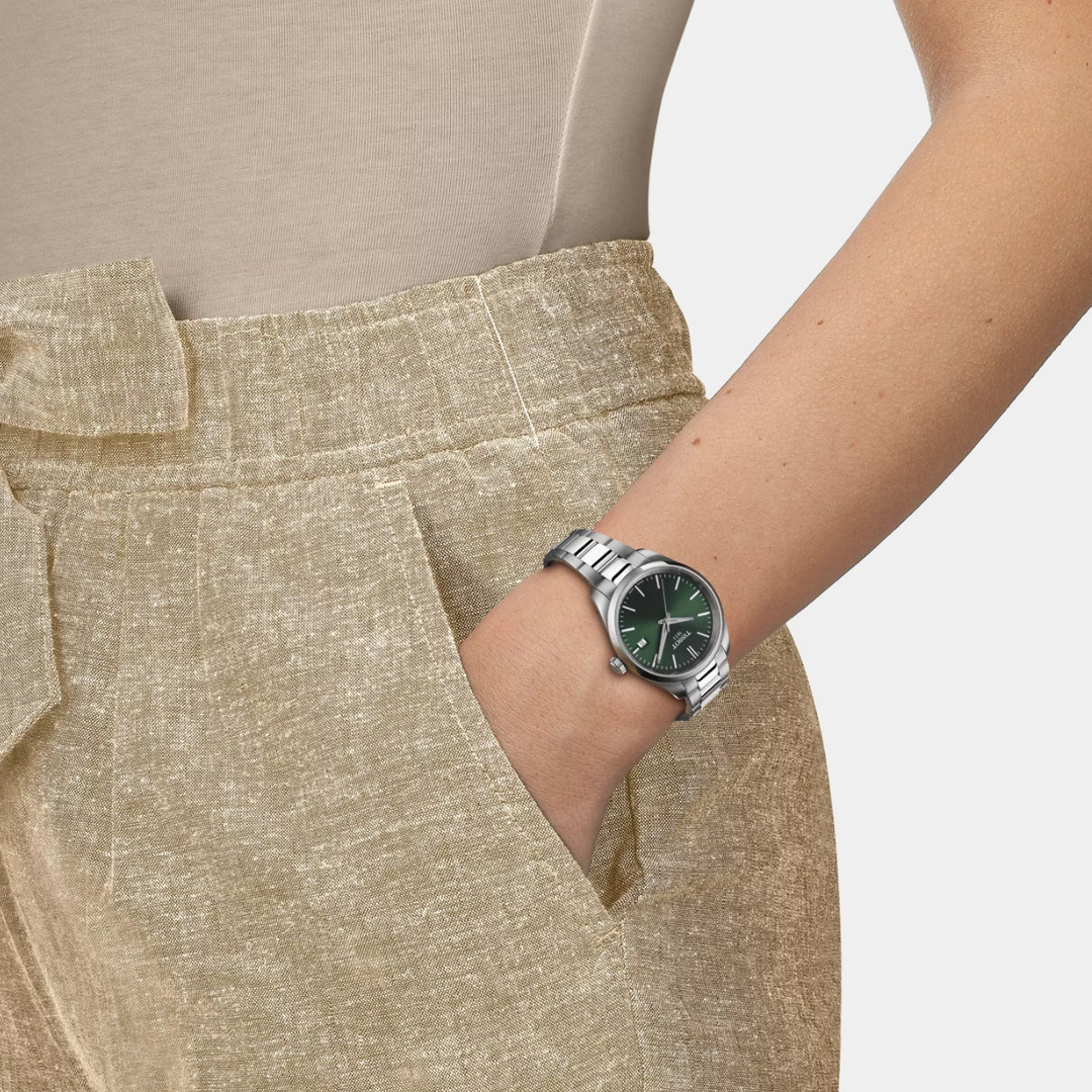 The green dial delivers confident character while maintaining clarity and structural balance. Its stainless steel build supports everyday resilience.This model is ideal for women seeking dependable Swiss precision paired with expressive styling.