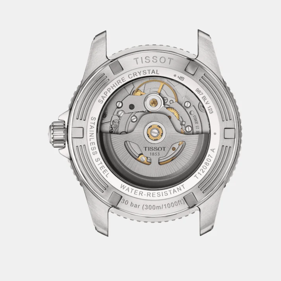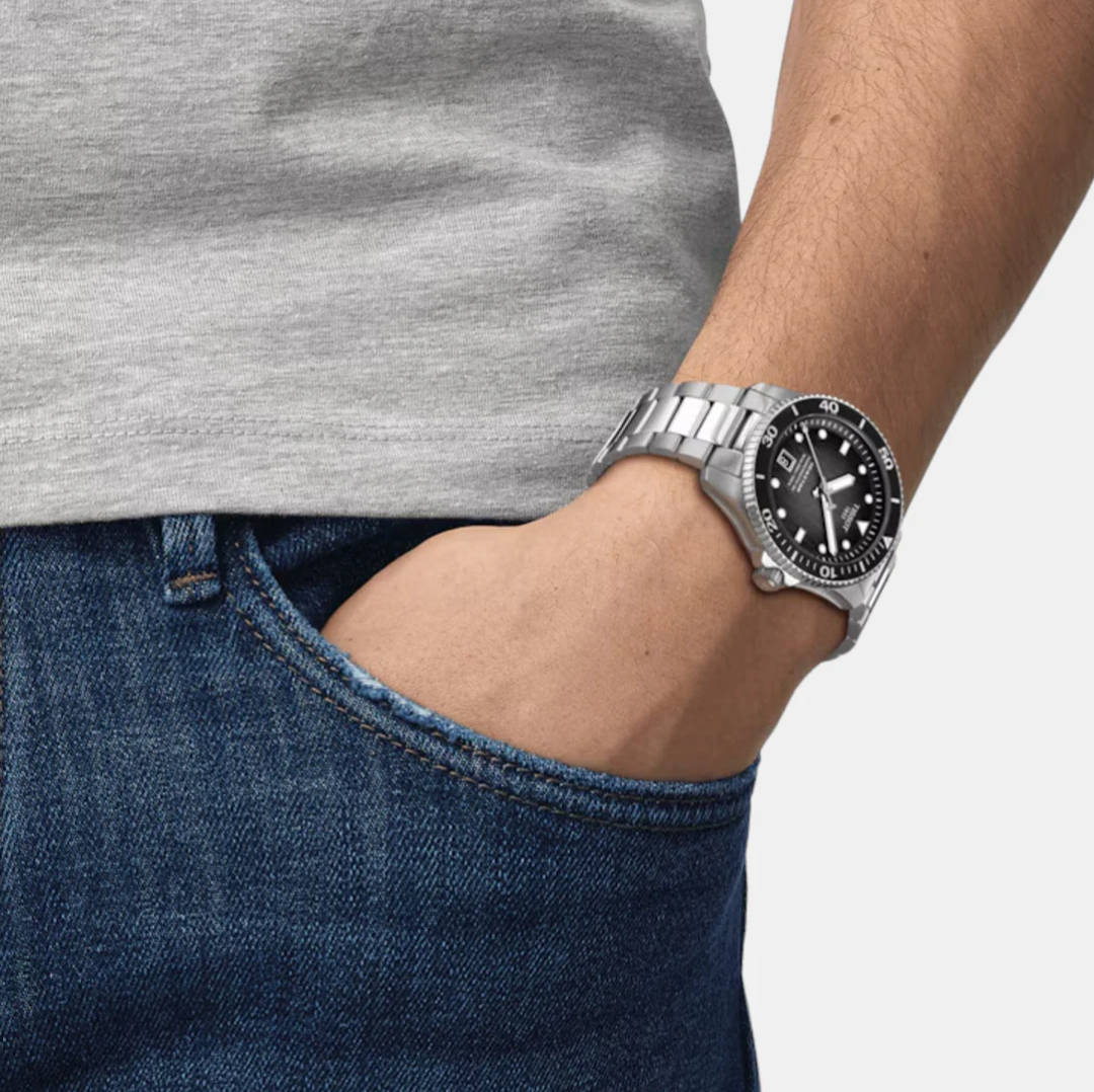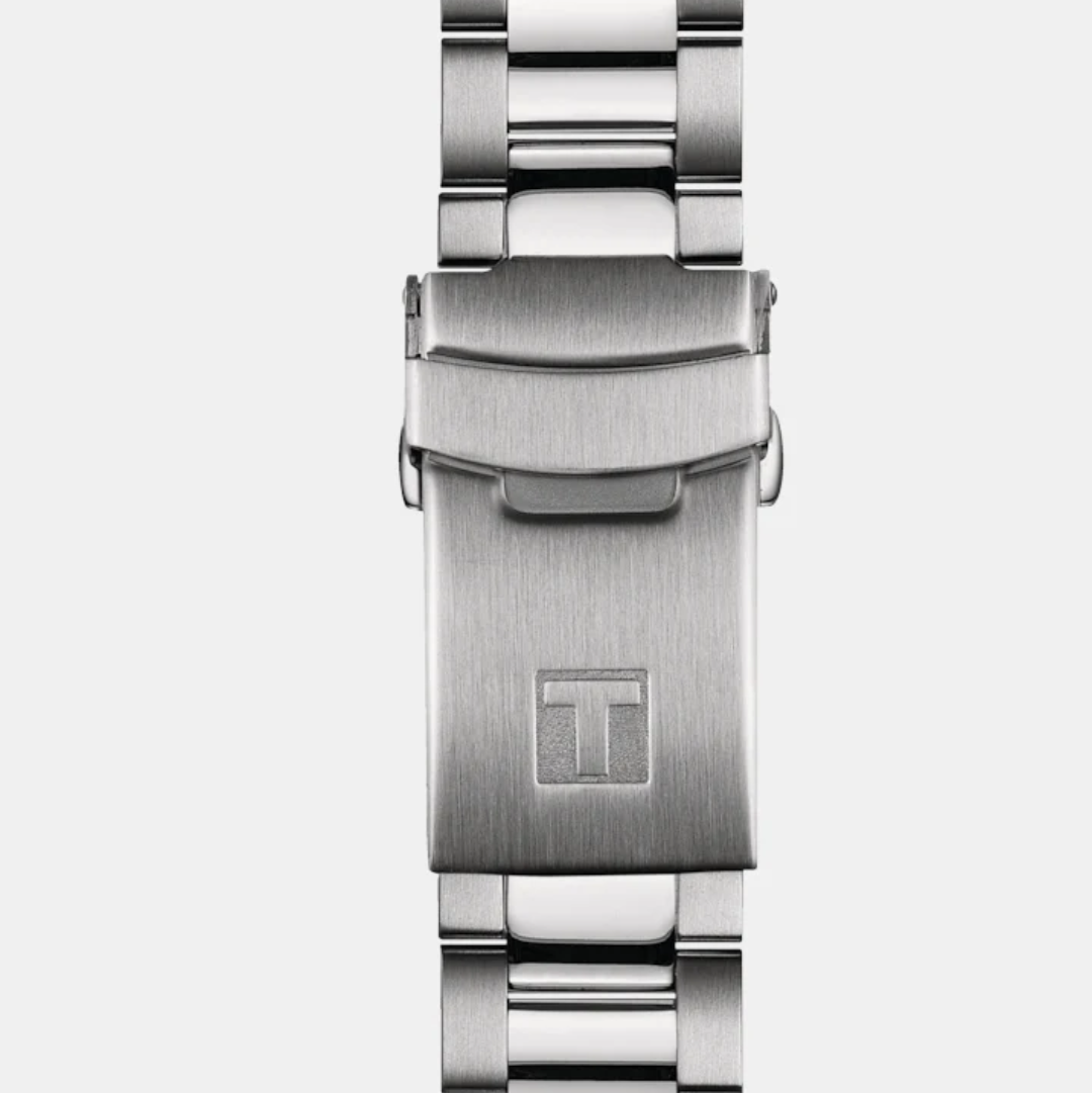 TISSOT. The black round dial is protected by a sapphire glass. It