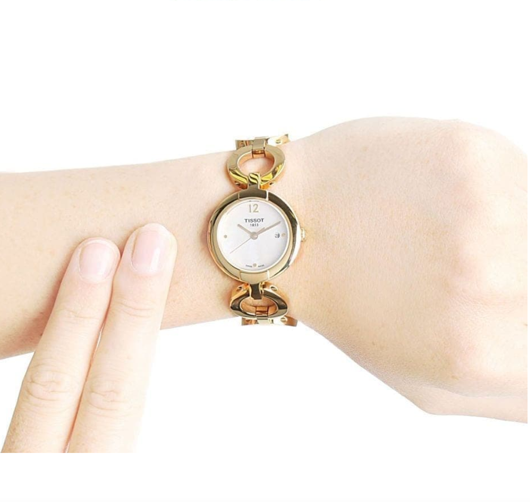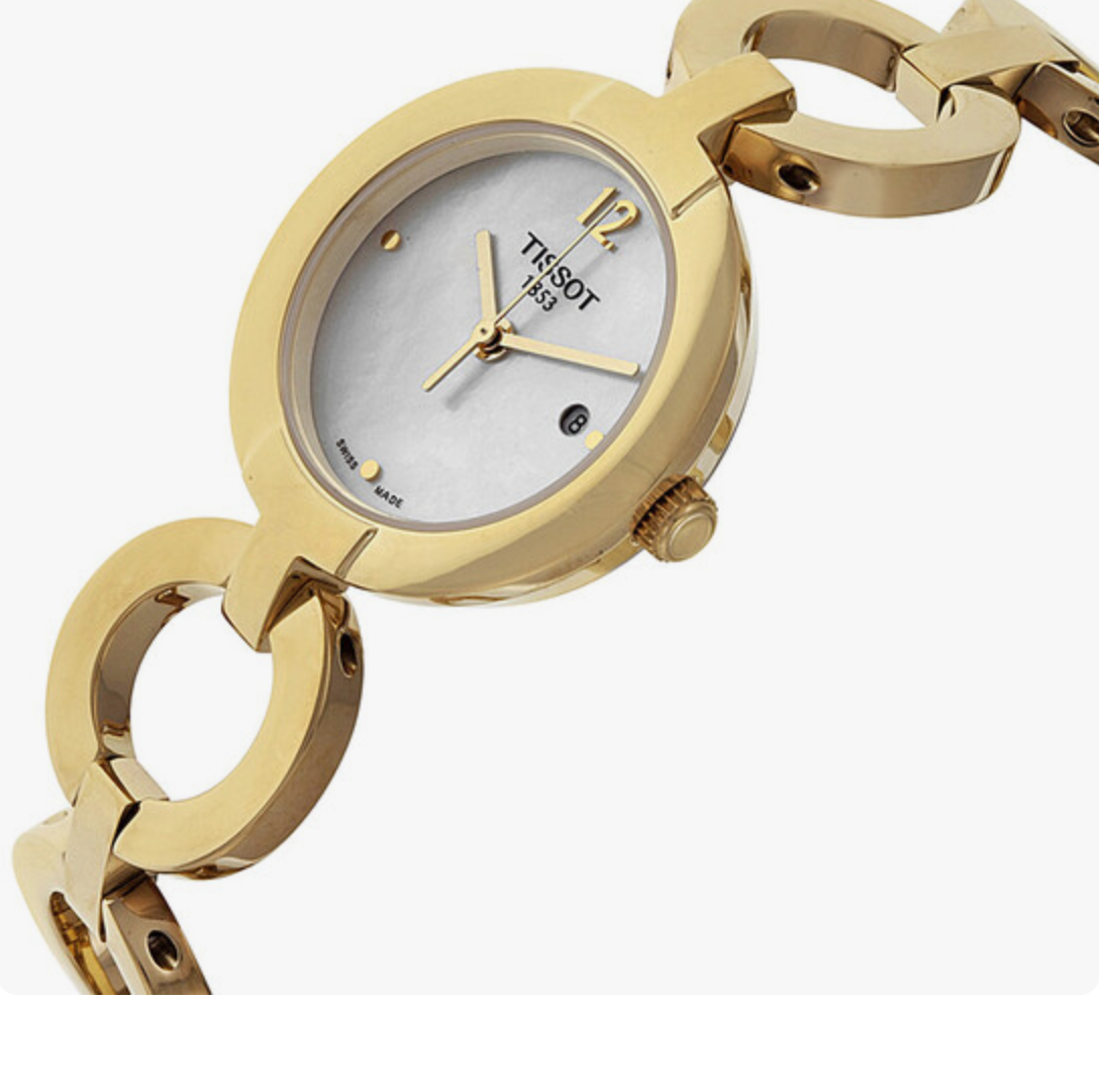 gold PVD bezel. Mother of pearl dial with gold-tone hands. An Arabic