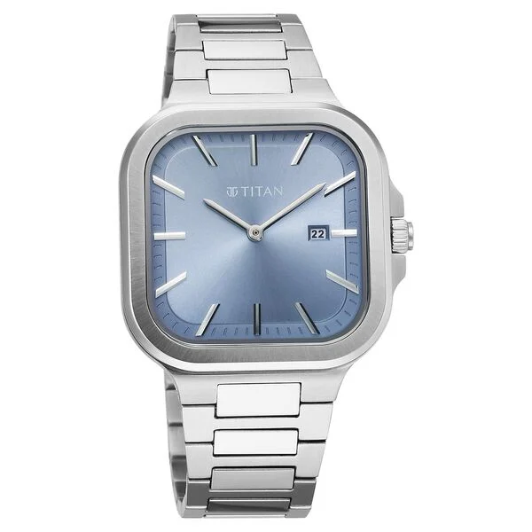 Titan Classique Slim Square Quartz Analog with Date Blue Dial Stainless Steel Strap Watch for Men