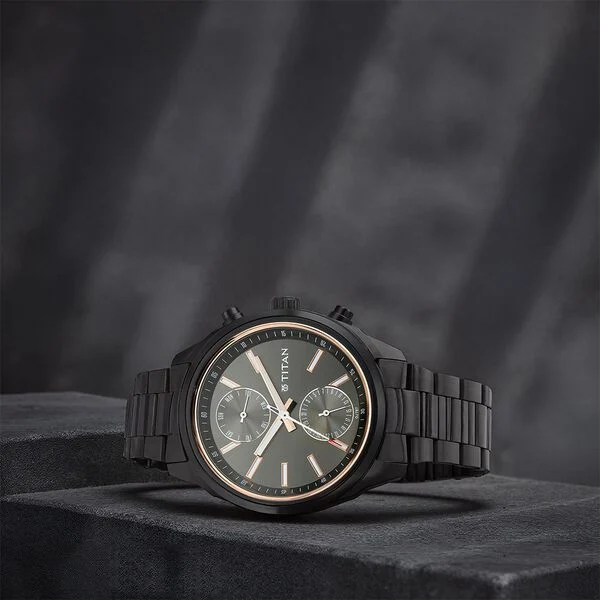 Titan Men's Metropolitan Luxe: Multifunction Mono black Dial with Two-Tone Stainless Steel Bracelet Watch