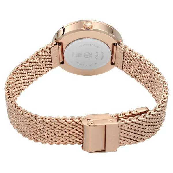 Planning on getting yourself or your loved one a watch that exudes sophistication and style? Then, this analog watch for women with celestial and cosmic elements in its design is the perfect fit. Featuring a round, black dial enclosed in a metal case, the bezel of the watch is a real showstopper with crystals along its rim. The Milanese rose gold-toned mesh strap is secured with a deployment clasp. With a blend of style and functionality, this signature watch is a part of Titan's extensive Stellar collection.