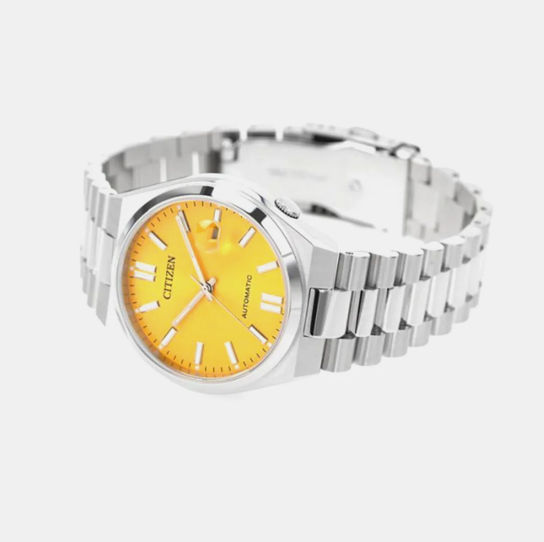 Discover Citizen watch for men, featuring a yellow dial, a silver strap made of stainless steel in a round case. Built with sapphire glass and stainless steel body to balance clarity and durability. Dimensions include 40 mm dial size, 23 mm strap width, 12 mm profile for comfortable wear. Key features: automatic movement, analog display, 10 atm water resistance. A secure folding clasp ensures a dependable fit.
