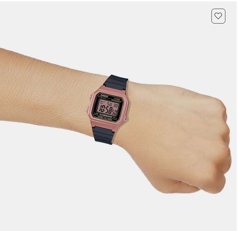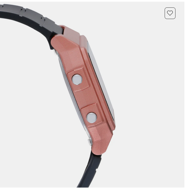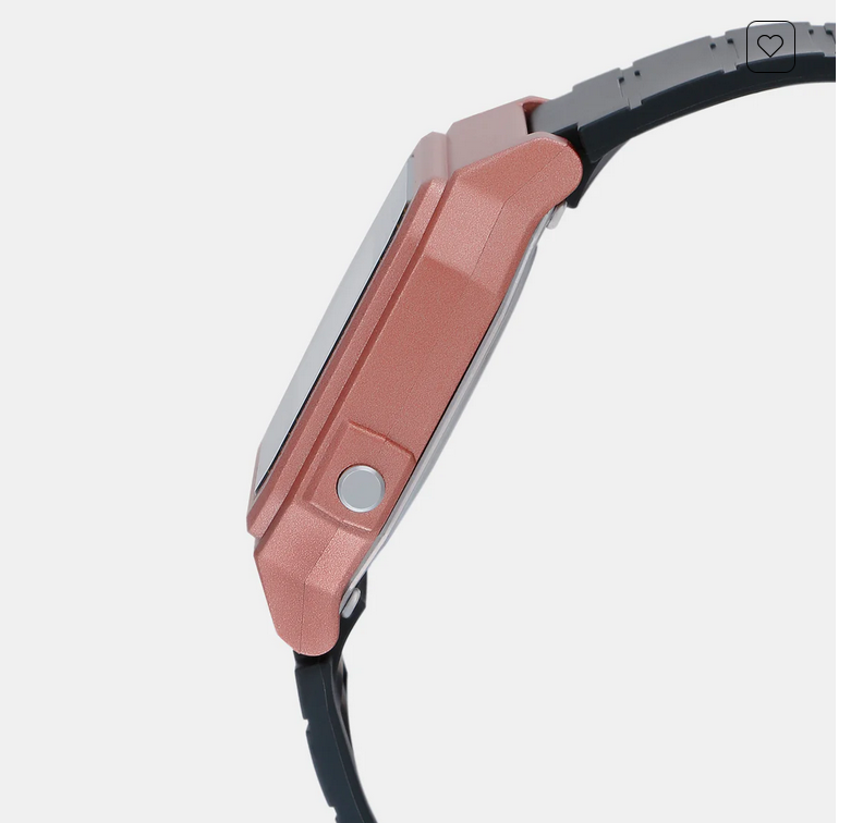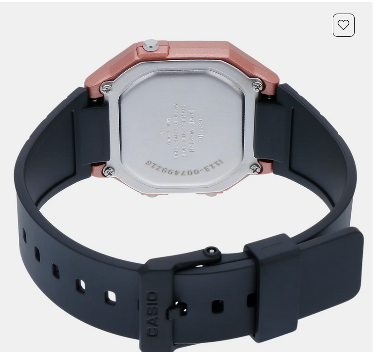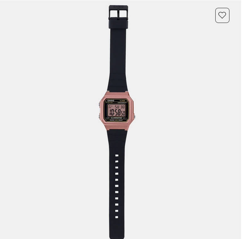Discover Casio watch for unisex, featuring a rose gold dial, a black strap made of resin in a square case. Built with resin glass and resin body to balance clarity and durability. Dimensions include 46 mm dial size, 20 mm strap width, 12 mm profile for comfortable wear. Key features: quartz movement, digital display, 5 atm water resistance. A secure tang buckle ensures a dependable fit.